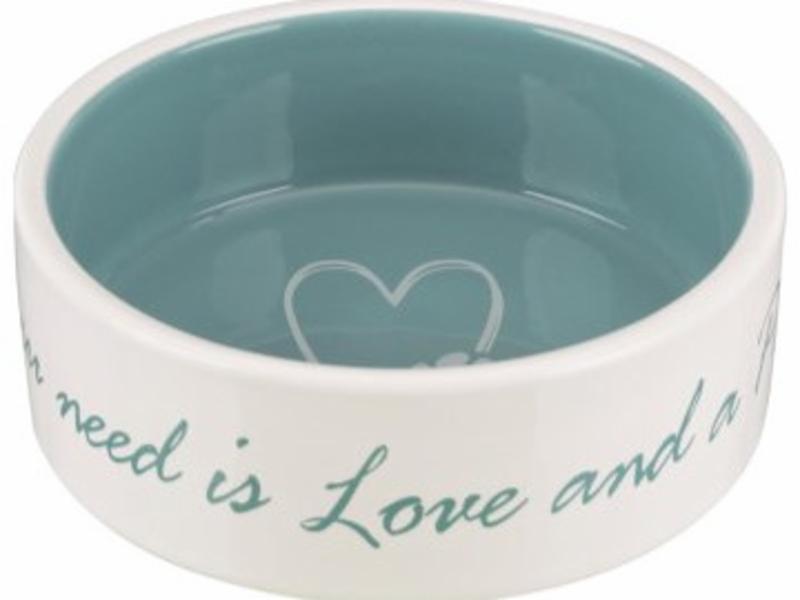 Teksten på skål i petrol: All you need is Love and a Pet